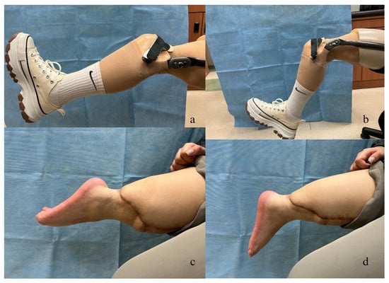 (a) Range of motion of the prosthetic knee joint: 20° of extensor lag. (b) Range of motion of the prosthetic knee joint: maximum flexion (70°). (c) Range of motion of the ankle joint: maximum plantar flexion (70°). (d) Range of motion of the ankle joint: maximum dorsiflexion (0°).