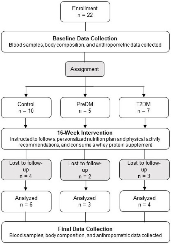 Twenty-two individuals (12 females, 10 males; distributed as follows into three groups: control, n = 10; preDM, n = 5; T2DM, n = 7) began the 16-week intervention at staggered time points between March 2019 and March 2020, and were characterized at the baseline based on their age, sex, and BMI (Figure 1; Table 1). There were no statistically significant differences in the distribution of these characteristics (sex, age, and BMI) among the three groups (Table 1), thus, making them unlikely to constitute confounding factors. Recruitment for this study was curtailed by COVID-19 public health-related state mandates, thus, significantly reducing the number of individuals able to participate in and complete this study. Nine individuals (four from the control group, two from the preDM group, and three from the T2DM group) discontinued their participation due to a variety of reasons, including COVID-19 restrictions, lockdown policies, and fear of participating due to the risk of COVID-19. Thirteen participants (seven females, six males; control, n = 6; preDM, n = 3; T2DM, n = 4) completed the 16-week intervention and returned for the final data collection.