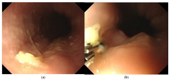 A 61-year-old male developed severe precordial pain 8 h after consuming raw fish sashimi (consisting of Lateolabrax japonicus, Salmo salar, Seriola quinqueradiata, and Lutjanus stellatus). The patient experienced a gradual increase in radiating pain to both sides of the neck, prompting him to visit the emergency department of our hospital the next day. The patient had no significant medical history or known allergies. He was 175 cm tall and had a healthy weight of 65 kg. A physical examination revealed a body temperature of 36.6 °C, blood pressure of 146/87 mmHg, a respiratory rate of 12 breaths per minute, an SpO₂ value (room air) of 99%, and was alert. Upon the auscultation of the chest, breathing sounds were found to be normal, no significant heart murmurs were detected, and no spontaneous or palpable pain was observed in the upper abdomen. An electrocardiogram did not reveal any signs of ischemic heart disease. We subsequently suspected anisakiasis based on the patient’s history of consuming raw fish and performed an esophagogastroduodenoscopy (EGD) using a GIF-H290 videogastroscope (Olympus, Tokyo, Japan) on the same day. The EGD revealed the presence of a worm-like structure, approximately 20 mm in length, embedded in the mucosa of the upper esophagus, approximately 25 cm from the incisors (Figure 1a). On the basis of anatomo-morphological features, the worm was provisionally identified as a third-stage Anisakis sp. larva by two gastroenterologists at Juntendo University (Eiji Kamba and Takashi Murakami). The molecular identification of the nematode was not performed. Acute mucosal lesions, other than the Anisakis sp. larva, or vanishing tumors were not found in the rest of the esophagus, stomach, and duodenum. The Anisakis sp. larva was swiftly and easily removed using biopsy forceps (Figure 1b) and the patient’s symptoms promptly improved to the point that within 15 h they had disappeared. Subsequently, the patient made a complete recovery.