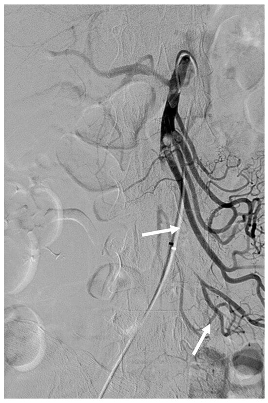 A 6F sheath was introduced into the right common femoral artery, and the SMA was selectively catheterized using a 5 Fr RH catheter (Cook Medical, Bloomington, IN, USA). Angiography revealed proximal SMA and CHA occlusions (Figure 1b).