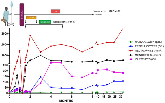 Unfortunately, abrupt pancytopenia appeared at day +35 after transplant (leukocytes 0.06 × 109/L, platelets 6 × 109/L, Hb 8.4 g/dL and reticulocytes 14 × 109/L) without evidence of bacterial, fungal or viral infection (negative EBV, CMV, adenovirus, human herpes virus 6 (HHV6) and parvovirus B19 DNAemias). A bone marrow smear was acellular, showing only eosinophil and mastocyte infiltration. Chimerism analysis at day +37 showed 27% and 16% of donor cells in bone marrow and peripheral blood, respectively, indicating early secondary graft rejection. After stimulation with granulocyte-colony stimulating factor (G-CSF), neutrophils increased progressively. Despite resumption of corticosteroid therapy at 1 mg/kg/day and continuation of ciclosporin, blood chimerism at day +47 showed only 3% of donor cells. In view of the progressive autologous reconstitution of the granulocyte lineage following administration of G-CSF, we decided to start a weekly romiplostim treatment with increasing doses up to 10 µg/kg. Cyclosporine was continued at a level range of 150–200 µg/L. Corticosteroid therapy was discontinued. The patient showed progressive autologous hematological reconstitution at day 60 with reticulocytes > 50 × 109/L, platelets > 20 × 109/L and neutrophils > 0.5 × 109/L despite discontinuation of G-CSF, without transfusion needs. At 3 months post-transplant we observed a full platelet recovery that prompted a gradual reduction in the thrombopoietin receptor agonist, with discontinuation at 5 months after allo-HCT. Ciclosporin was maintained at an effective dose until 1 year after transplant and gradually reduced, with definitive discontinuation at 2 years. There were no notable infections or specific drug toxicities (apart from those expected, i.e., hypertrichosis induced by cyclosporine) during the patient’s close medical follow-up. Up to date at 2 years and 8 months after the transplant procedure, the patient is in complete remission of his BMF, with autologous reconstitution and without any immunosuppressive regimen (Figure 1).
