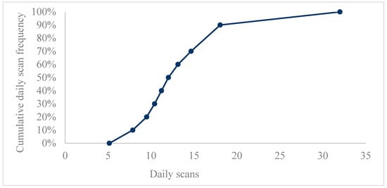 FSL users in Croatia performed on average 13 scans per day (M = 13.4 ± 7.4), with daily scans by readers shown in Table 1. The cumulative distribution of daily scans by readers is presented in Figure 1.