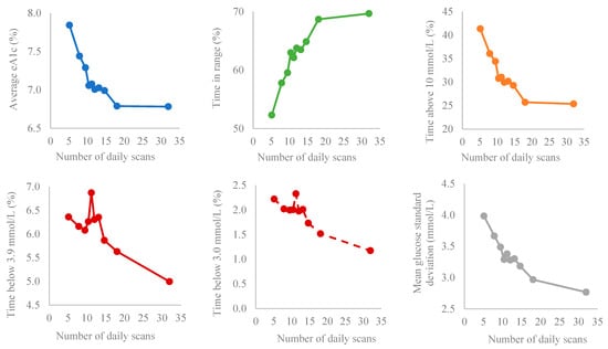 The relationship between the frequency of daily scans and glucometrics is summarized in Figure 2.