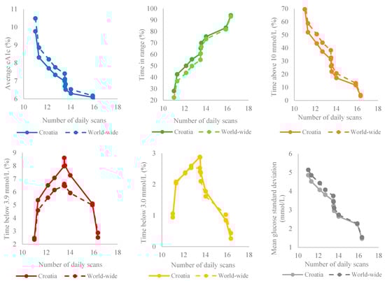 The primary outcome was the association between scanning frequency and glucose metrics parameters (glucose management indicator, GMI; TIR; time above range, TAR; time below range, TBR; standard deviation of glucose, SD; coefficient of variation, %CV). The additional outcome was to determine the optimal number of scans per day necessary to acquire adequate glycemic regulation by grouping data in bins according to TIR, thus avoiding high-frequency outliners. In addition, in both types of analysis, each bin was compared successively. Croatian glucose parameters were also compared with worldwide data.