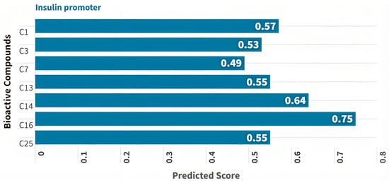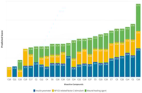 SAR-based prediction of CM leaf extract’s potential for treating T2DM, particularly as an insulin promoter. Seven compounds exhibited Pa values greater than 0.4. Remarkably, compound C16 stood out with the highest predicted value as an insulin promoter (Pa score of 0.75) and as an Nrf2 stimulant (Pa score of 0.46).