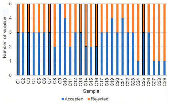 Prediction of compound drug-likeness within the CM leaf extract using Lipinski’s Rule of Five (Ro5). The bars outlined in black indicate the seven compounds selected for additional analysis. Out of the 29 bioactive compounds assessed, 26 were found to conform to the Ro5 criteria, indicating their potential as drug-like compounds.