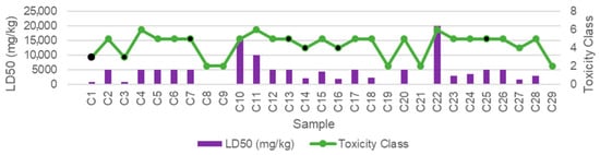 The toxicity of compounds can be categorized into six classes [] based on their lethal dose (LD50) when swallowed. Class I includes compounds that are fatal if swallowed with LD50 ≤ 5, while Class II consists of compounds with LD50 ranging from 5 to 50, also fatal if swallowed. Class III includes compounds with LD50 ranging from 50 to 300, considered toxic if swallowed. Compounds falling into Class IV have LD50 values from 300 to 2000, categorized as harmful if swallowed. Class V comprises compounds with LD50 values between 2000 and 5000, which may be harmful if swallowed. Finally, Class VI includes non-toxic compounds with LD50 > 5000. The results of toxicity assessment for the bioactive compounds indicated a generally low toxicity level, except for specific compounds that require close attention due to potential human hepatotoxicity (H-HT), drug-induced liver injury (DILI), hepatotoxicity, carcinogenicity, immunotoxicity, mutagenicity, and cytotoxicity when present as single compounds (Table 3 and Table 4). The average LD50 and toxicity class of 22 bioactive compounds ranged between Class IV and Class VI, suggesting that these compounds are predicted to be safe (Figure 4). However, it is crucial to underscore that these seven compounds (C1, C3, C8, C9, C19, C21, and C29) displayed lethal toxicity when ingested separately.