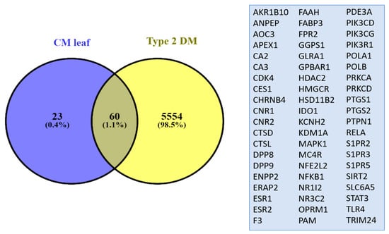 Venn diagram displaying the shared targets between the CM leaf extract and genes linked to T2DM. The CM leaf extract is suggested to have the potential to impact T2DM by modulating cytokines. This is supported by the fact that a significant number of proteins associated with the immune system are targeted by the extract, and these proteins are also associated with T2DM.