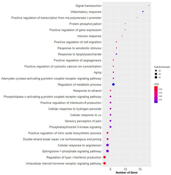 According to the gene ontology biological process analysis (Figure 6), the enrichment score indicates that the targets of CM leaf extract are primarily involved in the regulation of metabolic processes, cellular response to angiotensin, and the sphingosine-1-phosphate signaling pathway. Cellular response to angiotensin (pvalue < 0.05, enrichment 65.53) is a biological process closely associated with DM. However, when considering the number of gene targets involved, the CM leaf extract appears to have a more prominent role in the inflammatory response (pvalue < 0.05, enrichment 9.18). The genes involved in the cellular response to angiotensin include protein kinase C delta (PRKCD), nuclear factor-kappa B subunit p65 (RELA), nuclear factor-kappa B subunit 1 (NFKB1), and NFE2L2. Interestingly, RELA, NFKB1, and NFE2L2 are also associated with immune responses. Previous reports indicated that NFKB1 was upregulated in conditions of DM compared to control []. Increased NFKB1 levels have also been observed in studies comparing NFKB1 profiles between T2DM patients and normal glucose-tolerant individuals []. Another study also demonstrated that NFKB expression was elevated in T2DM and diabetic nephropathy samples []. NFKB1 was involved in the cellular response to angiotensin, where angiotensin II (ANG II) appeared to play a role in the regulation of insulin secretion by pancreatic beta cells and insulin sensitivity in peripheral tissues, two crucial factors contributing to the development of T2DM []. Therefore, it is suggested that NFKB1, in conjunction with its cytokine-regulating function, may play a role in insulin resistance and diabetogenesis [].