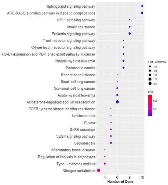 Annotation of the top 25 KEGG pathways targeted by CM leaf extract with FDR < 0.05. The most significant pathway targeted by CM leaf extract is the AGE-RAGE signaling pathway in diabetic complications. This pathway involves various proteins, including CDK4, STAT3, PRKCD, MAPK1, PIK3CD, PRKCA, PIK3R1, F3, RELA, and NFKB1. Some of these proteins are associated with inflammation, while others are involved in the PI3K receptor pathway related to T2DM. RAGE, a receptor for AGEs, plays a crucial role in this pathway, contributing to cellular stress and complications in diabetes.