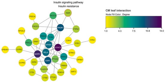 Protein–protein interaction (PPI) of CM leaf extract targets in T2DM. PIK3R1 is recognized as a prospective target of the extract, demonstrating its ability to interact with the insulin receptor (INSR). The node color intensity indicates the extent of protein interactions. This implies that the CM leaf extract is involved in pathways like PI3K/AKT signaling. Moreover, it affects inflammatory proteins, which are known to influence insulin signaling.