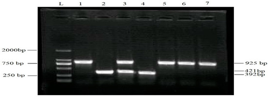 The genomic DNAs of the dermatophyte species were amplified with PCR using PsT primers. L indicates the lane containing DNA marker, lanes 1, 5, 6, 7 indicate specific bands for T. rubrum (925 bp), lanes 2 and 4 indicate specific bands for T. mentagrophytes (392 bp), and lane 3 shows specific and common T. violaceum (421).