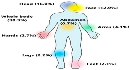 The site-wise percentage distribution of dermatological infections in the body of individuals.