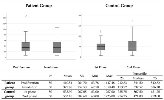 The comparison of VEGF serum levels between the patient group and the control group in the proliferation/1st and in the involution/2nd phase. N—number; SD—standard deviation; Min—minimum; Max—maximum.