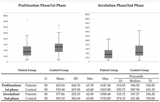 The control group had significantly higher serum VEGF levels compared to the patient group in the proliferation/first (p = 0.009) and in the involution/second (p = 0.019) phase (Figure 2).