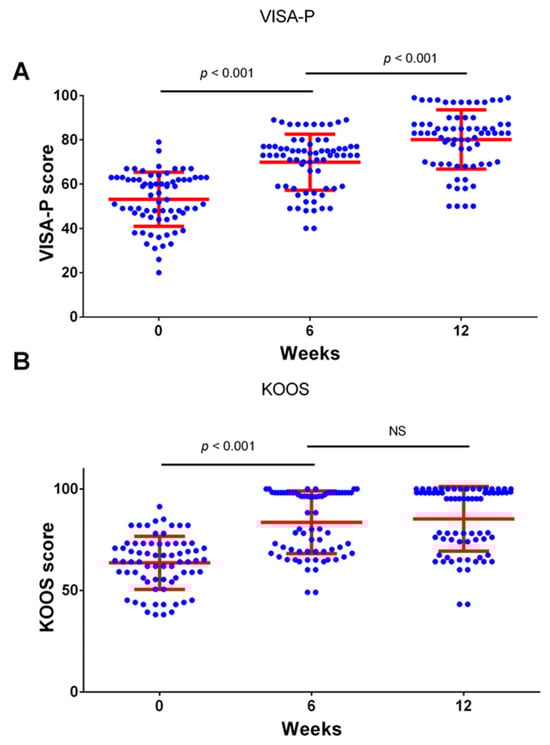 Clinical scores for VISA-P (A) and KOOS (B) at the beginning of this study, after 6 weeks of treatment, and after 12 weeks. Clinical scores were determined at indicated time points. Dots represent individual values, and lines represent mean with standard deviation. Comparisons were made using paired t-test with Bonferroni correction for multiple testing (n = 70 patients). NS—not significant. n = 70 patients.