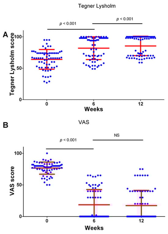 Clinical scores for Lysholm Knee Questionnaire/Tegner Activity Scale (A) and VAS score (B) at the beginning of this study, after 6 weeks of treatment, and after 12 weeks. Clinical scores were determined at indicated time points. Dots represent individual values, and lines represent mean with standard deviation. Comparisons were made using paired t-test with Bonferroni correction for multiple testing (n = 70 patients). NS—not significant. n = 70 patients.