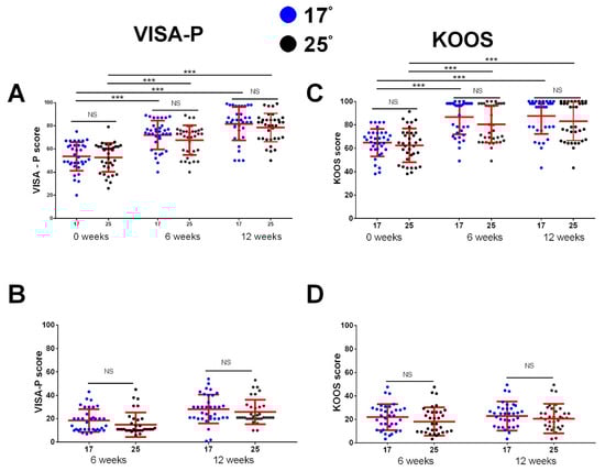 Improvement in clinical scores for VISA-P and KOOS at the beginning of this study, after 6 weeks of treatment, and after 12 weeks. Clinical scores were determined at indicated time points. Improvements in clinical scores (B,D) were determined by subtracting values measured at 6- and 12-week time points from 0 weeks. (A,C) shows comparison between the 17° and 25° group for VISA-P and KOOS scores at different time points (comparison performed using independent T test, NS for all comparisons); for each group, the values between the different time points were tested using paired T-test with Bonferroni correction (p < 0.001 for all comparisons, indicated by ***). In (B,D), the difference in improvement in clinical scores between the groups is shown (independent T test with Bonferroni correction). Dots represent individual values, and lines represent mean with standard deviation (n = 35 patients per group). *** p < 0.001, NS—not significant. n = 35 patients per group.