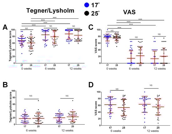 Improvement in clinical scores for Lysholm Knee Questionnaire/Tegner Activity Scale and VAS score at the beginning of this study, after 6 weeks of treatment, and after 12 weeks. Clinical scores were determined at indicated time points. Improvements in clinical scores (B,D) were determined by subtracting values measured at 6- and 12-week time points from 0 weeks. Calculated values for VAS score improvement are negative but, for clarity, were multiplied by −1. (A,C) shows comparison between the 17° and 25° group for Lysholm Knee Questionnaire/Tegner Activity Scale and VAS score at different time points (comparison performed using independent T test, NS for all comparison); for each group, the values between the different time points were tested using paired T-test with Bonferroni correction (p < 0.001 for all comparisons, indicated by ***). In (B,D), the difference in improvement in clinical scores between the groups is shown (independent T test with Bonferroni correction). Dots represent individual values, and lines represent mean with standard deviation (n = 35 patients per group). *** p < 0.001, NS—not significant. n = 35 patients per group.