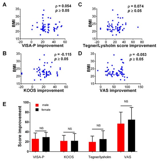 Association between the improvement in the measured clinical scores at the end of the study (12 weeks) and clinical characteristics of the patients. (A–D) show correlation (Spearman coefficient) between the BMI and VISA-P, KOOS, Lysholm Knee Questionnaire/Tegner Activity Scale, and VAS score, respectively. Dots represent individual values (n = 70 patients). In (E) comparison between male and female patients in the observed improvement in the clinical score (VISA-P, KOOS, Lysholm Knee Questionnaire/Tegner Activity Scale, and VAS score, respectively) at the end of this study (12 weeks), comparison was made using independent T-test. NS—not significant. n = 70 patients.