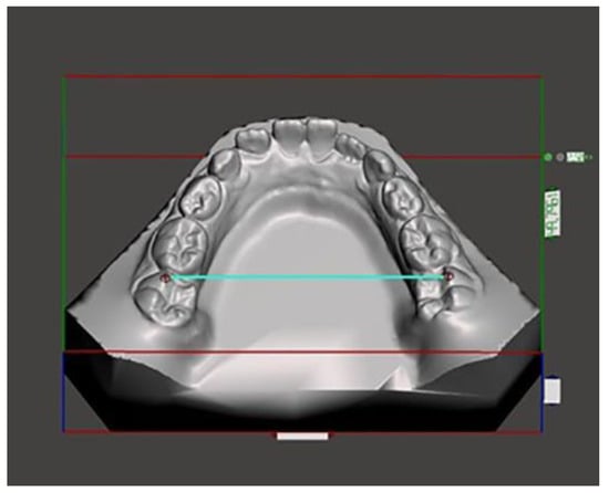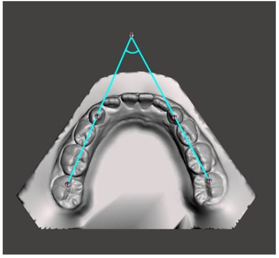Lateral head films (Gendex GXDP-700) were obtained, with the patient’s head positioned in a cephalostat, in centric occlusion, with adequate visualization of the reference structures, and without appreciable head rotation. All the lateral radiographs were captured by the same technician and on the same machine in the same radiology department. A cephalometric analysis was performed on the lateral cephalograms [,]. The following cephalometric skeletal variables were analyzed: SN-MP, PP-MP, OP-MP, PP-OP, N-GoMe, S-Go/N-Me, ANB, and Wits index. The landmarks and reference lines used in the cephalometric analysis were presented in Figure 1 and described in Table 2. The dental measurements are listed in Table 3 and described in Figure 2, Figure 3, Figure 4, Figure 5 and Figure 6. The linear and angular measurements, indicated in Table 2, were performed for each mandibular arch digital scan. To reduce the errors in the method, the cephalometric analyses were performed by a trained examiner, and all measurements were conducted twice by the same operator.
