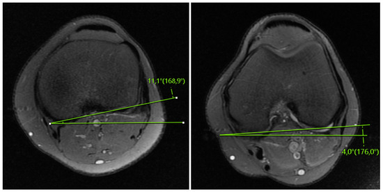 The FTR angle measurement was performed using MRI axial sections, as described by Vassalou et al. [12], and the measurement of femoral rotation was performed using the axial section at the level where the femoral condyles were widest in the anteroposterior direction. The angle between the line tangent to the posterior cortices of the femoral condyles and the horizontal line was determined as the femoral angle. The tibial rotation measurement was performed using the first axial section above the fibular head. The angle between the line tangent to the posterior cortices of the tibial condyles and the horizontal line was considered as the tibial angle. Internal rotation was considered as positive, and external rotation was considered as a negative value. The femorotibial rotation angle was obtained by measuring the absolute difference between these two angles (Figure 3).