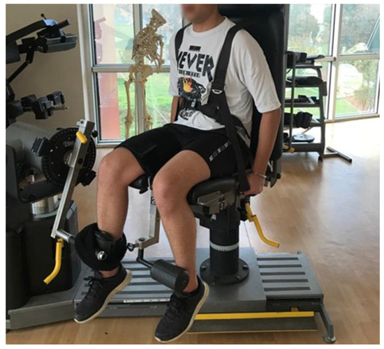 At 6 months postoperatively, the isokinetic strength of the knees in the patients with ACL reconstruction was measured. The patients visited the laboratory twice. Before measurements, the belts that prevented body and Q muscle movements were tightened by holding three fingers between the body and the Q muscle, and the subjects held the hand grips on both sides of the chair during the test. During the first visit, a trial measurement was performed for familiarization. On the second visit, the final isokinetic knee strength values were measured. The patients’ knee extension and flexion torques and the hamstring/quadriceps strength ratios were measured using an isokinetic dynamometer device (Humac Norm Testing and Rehabilitation System, CSMI, USA) (Figure 4) at three different angular velocities (60°, 180°, and 240°/s). Measurements for angular velocities of 60°/s and 180°/s were performed with 4 pre-test trials and 5 main test repetitions; for 240°/s, there were 4 pre-test trials followed by 15 main test repetitions. The protocols were applied uniformly to all patients. The torque values obtained from the measurements were recorded in newton meters, and the hamstring/quadriceps (H/Q) ratios were recorded as percentages.