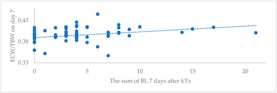 On the seventh day after kTx, all patients were in a hyperhydration state as determined by BIA and LUS methods. The tendency for lung congestion to reduce faster was observed in the IGF group (3.2 (3.39) vs. 4.83 (4.55), p = 0.064); however, the volume of fluid therapy per 24 h was significantly higher in this group (54.68 (18.13) mL/kg/24 h vs. 38.83 (34.58) mL/kg/24 h) (Table 4). There was a positive Spearman correlation between BL and ECW/TBW at day 7 post-transplantation (r 0.356, p = 0.004), as shown in Figure 1.