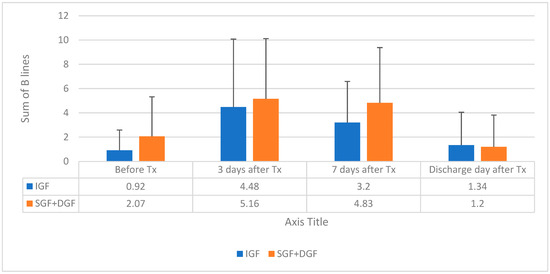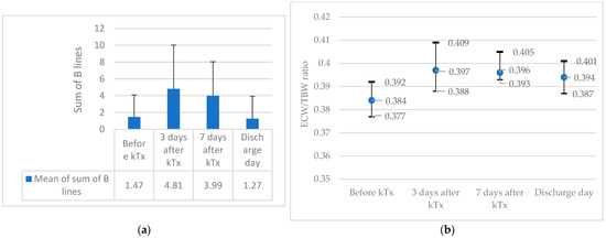 The manufacturer of the BIA analysis equipment provides a cut-off point of >0.390 for ECW/TBW to state overhydration. In both groups, overhydration was not observed before kTx and overhydration was established in both groups during the observation period after kTx without significant differences between the groups. The BL sum showed a hyperhydration state of the lungs before kTx in the SGF + DGF group (0.92 (1.67) vs. 2.07 (3.25), p = 0.037), and during observation periods, lung congestion was not reduced until discharge day, as shown in Figure 2.