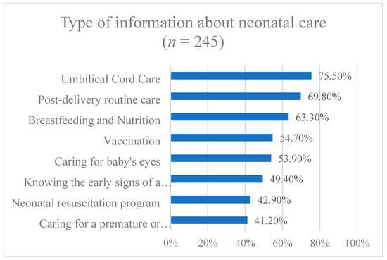 As shown in Figure 1, over half of the participants had basic knowledge of neonatal care, such as umbilical cord care, breastfeeding and nutrition, vaccination, post-delivery routine care, and neonatal eye care.