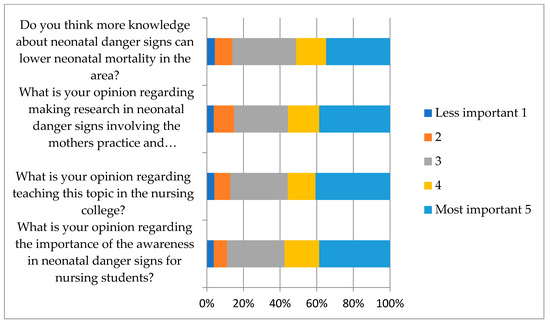 The responses related to the four questions regarding attitude showed that about half of the students had a good attitude towards the importance of the knowledge of neonatal danger signs for nursing students, their opinions regarding teaching this topic in the nursing college, their opinions regarding researching neonatal danger signs involving mothers’ and caretakers’ practice and knowledge in the Jazan region, and their thoughts on the role of knowledge in lowering neonatal mortality in the area. Figure 2 shows the distribution of students’ responses to the questions on attitude using the Likert scale.