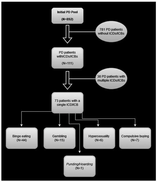 A total of 892 PD cases were examined through an archival study of the records of the Specialized Movement Disorders Outpatient Clinic of the First Neurology Department at Eginition Hospital, National and Kapodistrian University of Athens. Diagnosis of PD was established by senior neurologists specialized in movement disorders on the basis of formal diagnostic criteria [,], after a comprehensive neurological, cognitive, and neuroimaging evaluation, including Unified Parkinson’s Disease Rating Scale (UPDRS) for motor/non-motor assessment and MoCA (Montreal Cognitive Assessment) Scale. ICDs and/or ICBs were identified on the basis of a detailed clinical interview. During this clinical interview, the clinician asked questions investigating dopamine dysregulation syndrome, nutrition, sexual activity, gambling, money spending, leisure time activities, and hobbies. Of particular interest was the identification of behavioral patterns indicating ICDs/ICBs. Impulse control disorders and behavioral addictions are mainly characterized by repetitive lack of control, i.e., inability to resist despite the resulting severe psychosocial and/or financial consequences, as well as reduction of functionality in certain domains of daily living, including, among others, working, studying, and personal relations []. In this diagnostic framework, the clinician meticulously gathered information by thoroughly interviewing the patient in order to record specific behavioral patterns of interest as ICB or ICD manifestations. When the patient was escorted by a caregiver, the latter was also interviewed about the course of the disease, potential difficulties, and changes in everyday life’s activities, as well as for observed ICD/ICB signs. The above information was included in the patients’ files that were retrospectively and individually examined by our group. The outcome of this case-by-case investigation resulted in the provided frequencies of ICDs/ICBs presented in this study.