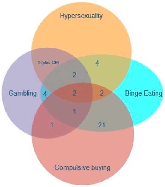 The most common addictive behavior was compulsive binge eating, followed by compulsive buying, then gambling, and lastly, hypersexuality. In general, our findings are in accordance with other studies for a review, see [], even though the relative frequencies observed in our sample differed from other reported data []; for a review, see []. It should be noted that in the general population, the prevalence of compulsive buying is 4.9% []; see also [], while older studies have provided estimates of up to 16% []. The prevalence of binge eating ranges from 0.7% to 1% [] and lifetime prevalence of pathological gambling is between 0.4 and 1% []; see also []. As for hypersexuality, even though there is no classification for a corresponding disorder in DSM5, and therefore, epidemiological studies are generally lacking, a safe prevalence rate is estimated at the range of 3–6% []. The above prevalence rates seem to depend on sociodemographic factors, e.g., [,]. This is also reflected in our results, since males exhibited gambling and hypersexuality more frequently compared to females, while the opposite pattern was observed with regard to compulsive binge eating.