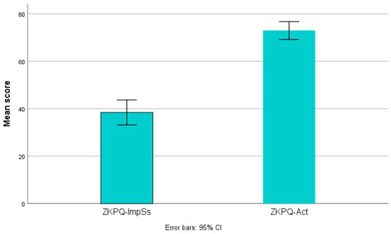 Error bar chart showing mean scores on the ZKPQ subscales for activity and impulsivity/sensation seeking.