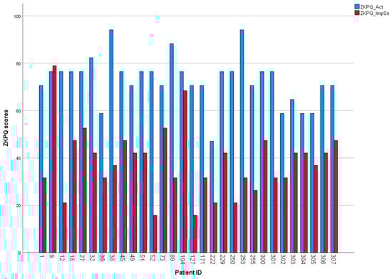 Table 2 presents the scores on psychometric tools. After initial conduction of descriptive statistics, we observed the discrepancy between mean values of the impulsiveness-sensation seeking trait (which was predetermined as a variable of interest for the scope of our study) and the activity trait. Therefore, we decided to compare these two variables and carry out a case-by-case investigation. Paired-samples t-test revealed that the observed difference is statistically significant [t(29) = 11.695, p < 0.001)] (see Figure 3). Moreover, the case-by-case investigation revealed that almost all patients exhibited this discrepancy individually (see Figure 4).