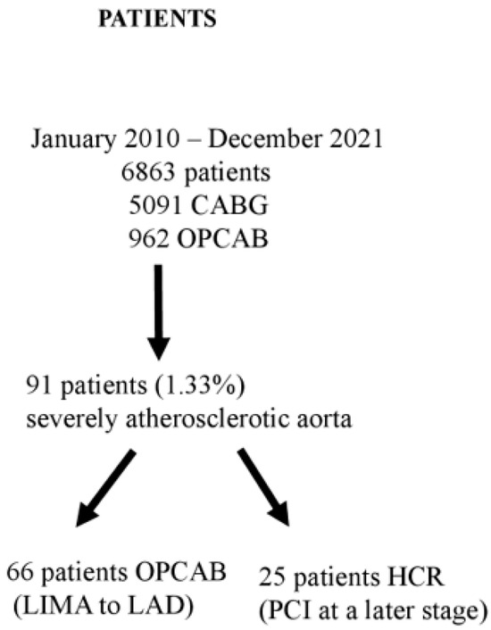 We designed a single-centre real-world retrospective observational study analysing patients from cardiosurgical registry (https://www.nczisk.sk) operated at the National Institute of Cardiovascular Diseases in Bratislava, Slovakia, in the period between 2010 and 2021. During that period, 6863 surgical revascularisation procedures (5901 CABG and 962 OPCAB) were performed. Ninety-one patients (1.33%) were diagnosed with severe atherosclerosis of the ascending aorta. This group of includes patients with multivessel coronary disease that were high-risk or unsuitable for conventional surgery. All coronary stenoses were ≥70%. The patients (91/962 (9.46%) underwent OPCAB procedures because it was impossible to perform cannulation of the ascending aorta and applied cross-clamp (Figure 1).