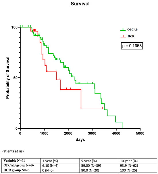 The hospital mortality was 4.55% in group 1 vs. 0% in group 2 (p = 0.7634). The 1-, 5-, and 10-year mortality rates in the two groups were 6.1% vs. 0%, 59% vs. 80%, and 93.9% vs. 100%, respectively. The mean time from OPCAB or PCI to death was 1267.09 ± 850.64 days. The long-term survival is shown in Figure 2 (p = 0.1958).