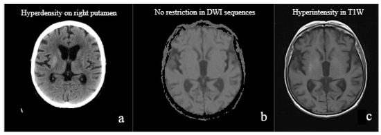 Imaging findings. (a) Brain CT (28/01/2022) with evidence of a hyperdense alteration on the right putamen. (b,c) MRI (10/05/2022) in DWI and T1W sequences with evidence of a persistent hyperintense lesion on the right putamen and no sign of restriction in diffusion sequences.