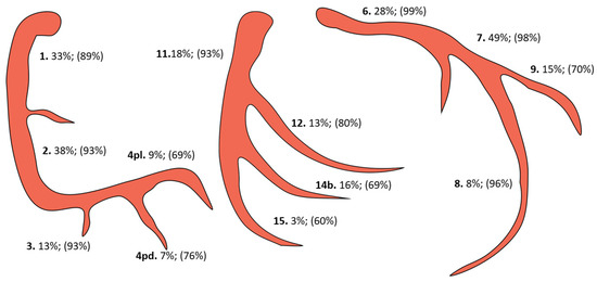 Morphological coronary characteristics and revascularization rates are reported in Table 2. The detailed description using the AHA Committee reporting system is depicted in Figure 1. The 1111 patients had a total of 1371 CTOs with 1.24 (±0.45) CTO/patient. A total of 1204 of the CTOs (1.08 ± 0.54 CTOs/patient, or 87.8%) were successfully bypassed. There was no significant difference between survivors and non-survivors regarding the number of CTOs or the revascularization rate (p = 0.989, p = 0.974). In 68.4% of the study population, there was a CTO localized in the RCA system, 26.4% in the LAD, and 28.5% in the LCX system. Multiple CTOs were present in 22.6% of the patients with 8.5% involving the RCA and LAD systems, 10.4% the RCA and LCX systems, 2.7% the LAD and LCX systems, and 1.1% involving all three main coronaries. There was no significant difference between the two groups regarding the CTO localization (RCA p = 0.543, LAD p = 0.616, LCX p = 0.777). RCA-CTOs were revascularized in 89.1% of cases and in 91.2% of cases when the occlusion was located in the first three segments of the RCA system (excluding seg. 4). In the case of LAD-CTOs, the lesions were bypassed in 93.2% of the cases and in 97% of the cases when the CTO was located in the main vessel (excluding segs. 9 and 10). The revascularization rate of the LCX-CTOs was 83.6% for the LCX system and 86.3% when the distal part (segments 14b, 15) was excluded (Figure 1). The revascularization rates of the CTOs in the LCX position were significantly lower when compared with the LAD position (p < 0.001) but not when compared with the RCA position (p = 0.07). Full CTO revascularization was achieved in 86.1% of patients with no significant difference between survivors and non-survivors (p > 0.99).
