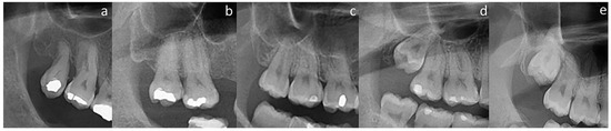 - Dias, M.J.; Franco, A.; Junqueira, J.L.; Fayad, F.T.; Pereira, P.H.; Oenning, A.C. Marginal bone loss in the second molar related to impacted mandibular third molars: Comparison between panoramic images and cone beam computed tomography. Med. Oral Patol. Oral Cir. Bucal 2020, 25, e395–e402. [Google Scholar] [CrossRef]