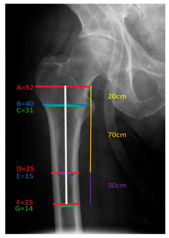 - Nguyen, B.N.; Hoshino, H.; Togawa, D.; Matsuyama, Y. Cortical Thickness Index of the Proximal Femur: A Radiographic Parameter for Preliminary Assessment of Bone Mineral Density and Osteoporosis Status in the Age 50 Years and Over Population. Clin. Orthop. Surg. 2018, 10, 149–156. [Google Scholar] [CrossRef]