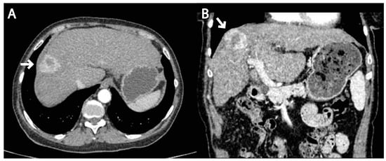 A 65-year-old female patient was admitted to the surgical clinic with previous computed tomography (CT)-detected presentation of a subcapsular 3 cm solitary, hypervascular, primary liver tumor in segment VIII, in the setting of a cirrhotic liver caused by chronic HCV infection, highly suggestive of an HCC (Figure 1). The CT scan demonstrated signs of portal hypertension, such as recanalization of paraumbilical veins and discrete venous collaterals in the omentum and esophageal varices. Additionally, there was no evidence of extrahepatic disease in the thorax, abdomen or pelvis, nor signs of ascites. Upon admission to the hospital and detailed clinical and laboratory work-up, the patient was classified as Child–Pugh class A, with the following values: total bilirubin level of 20.2 mmol/L, albumin level of 39 g/L, International Normalized Ratio (INR) of 1.16, without signs of ascites or encephalopathy. Furthermore, the patient’s performance status, assessed via the Eastern Cooperative Oncology Group (ECOG) grading system [], was 0. Considering the patient’s favorable performance status, without comorbidities, and Child–Pugh class A, the patient met the stage A criteria of the Barcelona Clinic Liver Cancer (BCLC) system [], and curative-intent surgical intervention (open anatomic resection of liver segment VIII) was performed. During the surgical procedure, a subcapsular tumor of approximately 3 cm in size, localized in segment VIII of the liver, was observed, which was protruding on the surface of the liver parenchyma and adhering to the peritoneal lining of the right hemidiaphragm. This finding was confirmed with an intraoperative ultrasound. Initially, a part of the hemidiaphragm around the tumor was resected without opening the right hemithorax, and then further resection of segment VIII of the liver was performed using radiofrequency resection (RFS), along with the ablation of the pedicle for the mentioned liver segment. The resected area showed no signs of bleeding and was hemostatically controlled. The pathohistological (PH) report of the resected specimen confirmed the presence of a moderately differentiated G2 trabecular-type HCC, with a pathological Tumor–Node–Metastasis (pTNM) staging in the IB prognostic group, which consists of T1b (solitary tumor > 2 cm without vascular invasion), N0 (no regional lymph node metastasis) and M0 (no distant metastases). The surgical margin was microscopically negative for residual tumor—R0 resection (no residues of the tumor on the surgical margin). The postoperative course was uneventful, and the patient was discharged from hospital on postoperative day 7. The first follow-up visit was scheduled for one month and furthermore on a 6-month basis. Given the curative R0 resection, no chemo- or radiotherapy were advised.