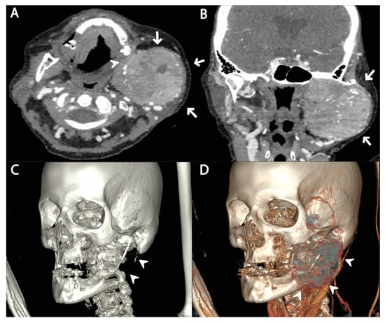 Axial (A) and sagittal (B) images of contrast-enhanced neck CT scan show a large, lobulated and intensively opacified osteolytic soft-tissue mass in the left mandible angle and ramus (arrows), extending from the base of the skull to the mandibular angle. Infiltration of masticatory muscles is observed as well. The volume-rendered images show destructed left mandibular ramus and mandible angle (arrowheads) due to tumor invasion (C), as well as an image of vascular 3D reconstruction, which shows highly vascularized tumor (arrowhead) (D).