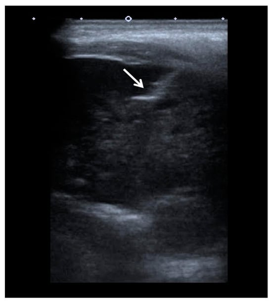 The ultrasound image of the left mandibular region mass obtained during the percutaneous ultrasound-guided core needle biopsy (arrow) shows the core biopsy needle inside the left mandibular region mass.
