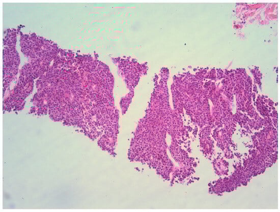 The patient was referred to the Department of Interventional Radiology in consideration of a percutaneous biopsy of the mass. The core biopsy of the mass in the left mandibular region was performed under ultrasound guidance (Figure 3) using an 18-gauge disposable guillotine spring-loaded needle for biopsy of soft tissue (BD, Biomedical Srl, Firenze, Italy). Pathohistological (PH) findings revealed a metastatic carcinoma in the left mandibular region, completely consistent with the previously diagnosed trabecular type of hepatocellular carcinoma (Figure 4). There were no other sites of disease dissemination upon an endocranial, neck, chest, abdominal and pelvic CT performed shortly after. The maxillofacial oncological team concluded that due to the prolonged recovery from COVID-19 disease, as well as due to the accelerated disease progression and poor prognosis of patients with extrahepatic disease, the surgical treatment of the mandible lesion was not indicated, and the treatment was continued with symptomatic and palliative treatment. Ten months later, the patient died due to hepatic decompensation and local spread of the metastatic disease. However, there were no clinical or radiological signs of recurrent disease in the liver.