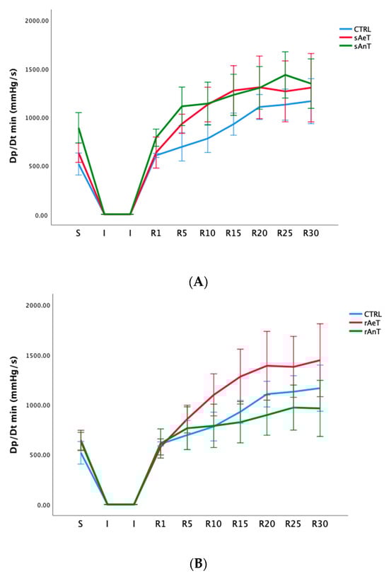 Values of minimum rate of development of left ventricular pressure (A): CTRL, sAeT, and sAnT groups; and (B): CTRL, rAeT, and rAnT. Results are presented as mean ± standard error of mean.