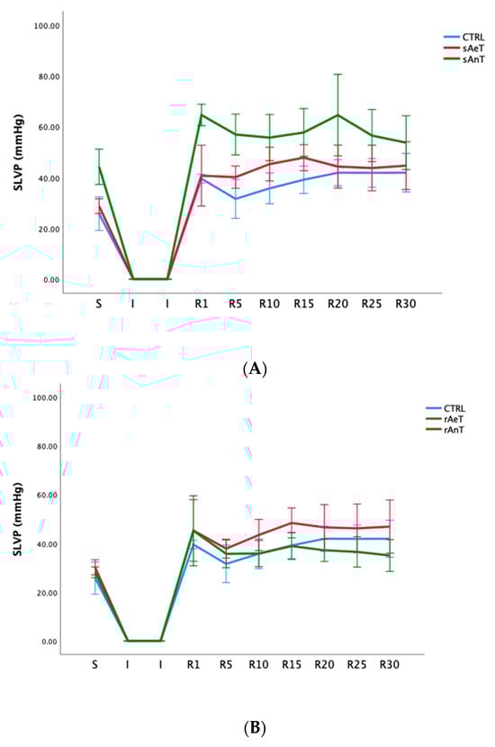 Values of systolic left ventricular pressure in (A): CTRL, sAeT, and sAnT groups; and (B): CTRL, rAeT, and rAnT. Results are presented as mean ± standard error of mean.
