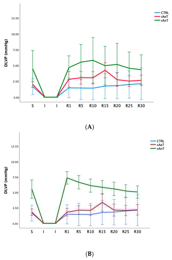 Values of diastolic left ventricular pressure in (A): CTRL, sAeT, and sAnT groups; and (B): CTRL, rAeT, and rAnT. Results are presented as mean ± standard error of mean.