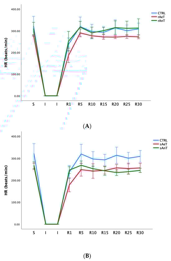Values of heart rate (HR) in (A): CTRL, sAeT, and sAnT groups; and (B): CTRL, rAeT, and rAnT. Results are presented as mean ± standard error of mean.