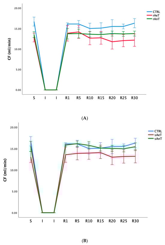 Values of coronary flow (CF) in (A): CTRL, sAeT, and sAnT groups; and (B): CTRL, rAeT, and rAnT. Results are presented as mean ± standard error of mean.